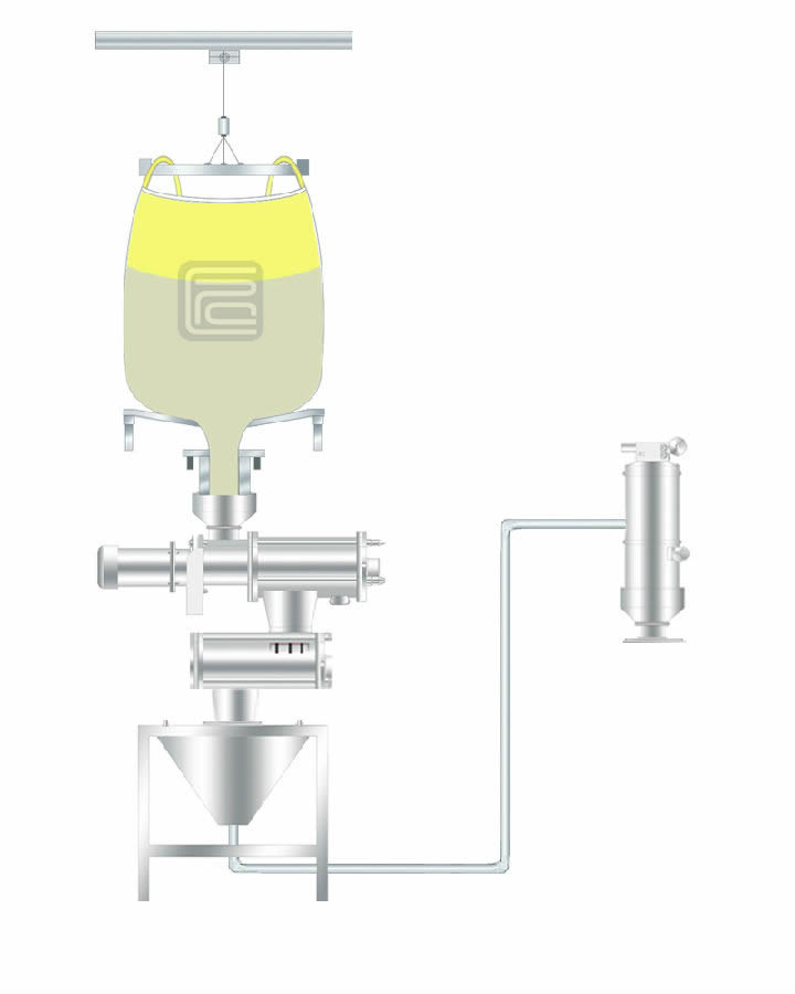拆包輸送系統(tǒng)實(shí)際上是由:拆包設(shè)備(拆包機(jī))+輸送設(shè)備(真空上料機(jī))兩大部份組成,而拆包設(shè)備通常又根據(jù)包裝袋不同而分為:大袋拆包機(jī)和小袋拆包機(jī),無論是哪一種都可以進(jìn)行上吸料和下吸料工作,以下就用圖示為大家演示一下: